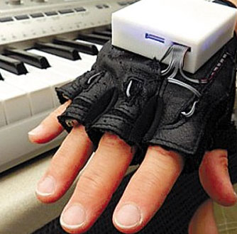 这种手套又被称为移动音乐触摸器。只需配上电池,打开开关,戴手套者就会根据手套不同部位的震动,去调节自己的手指进行活动。与钢琴键盘配合使用时,只要将曲目编制成程序,调入相应的电脑设备中,通过无线连接,戴手套者即可以根据提示,弹奏出这些曲目。反复练习后,它便可以帮助我们更快地记住钢琴曲谱。